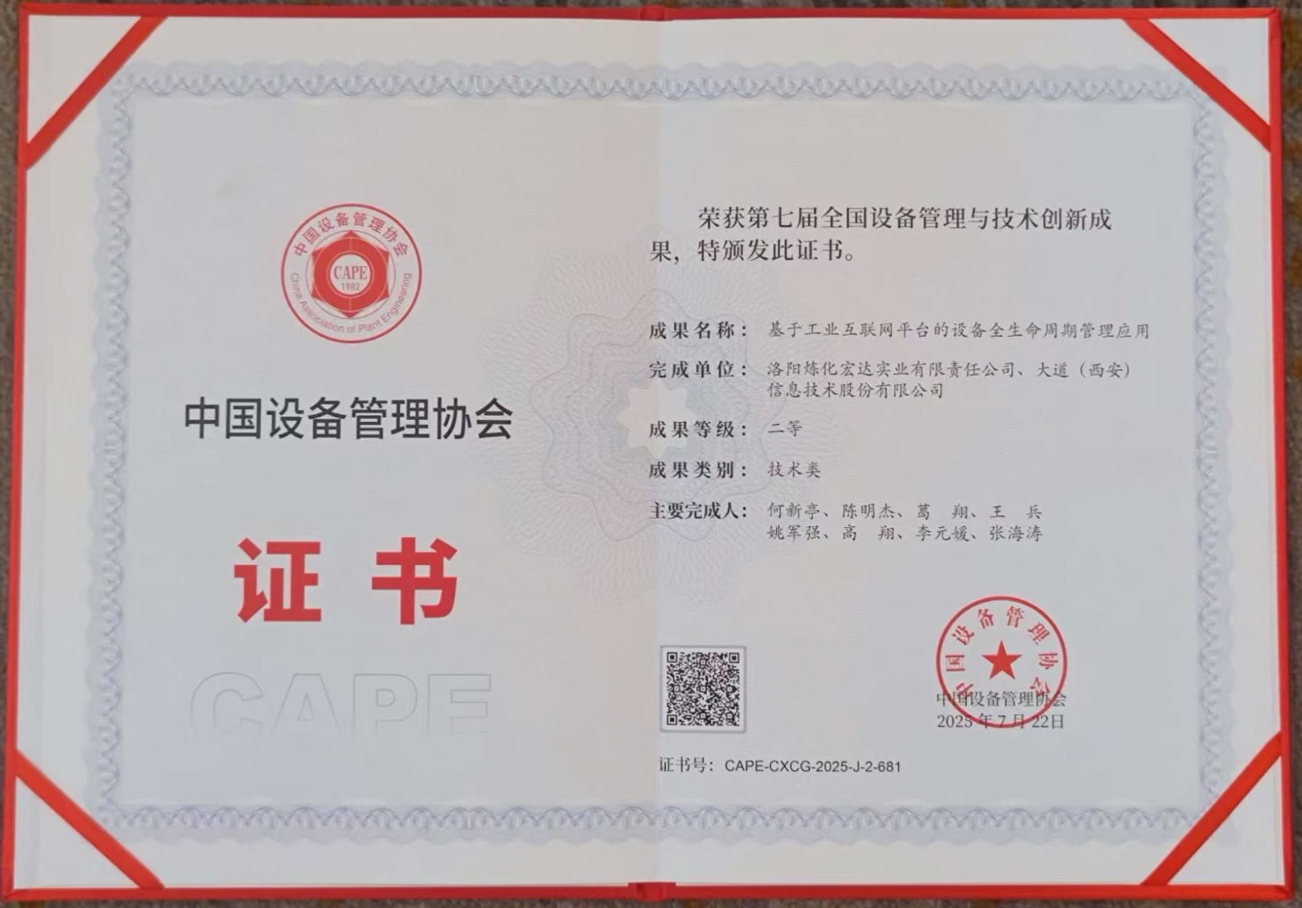 喜报!公司“基于工业互联网平台的设备全生命周期管理应用”荣膺全国设备管理与技术创新成果二等奖